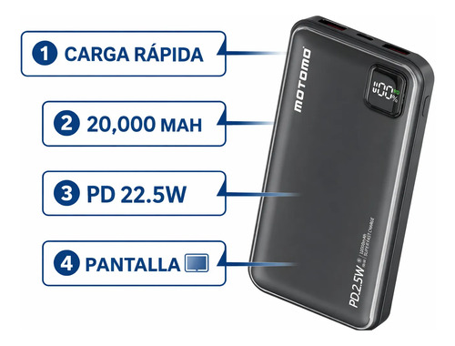 La Powerbank Batería Externa 20.000 mAh PD 22.5W MO-34L de Motomo es la solución ideal para quienes buscan energía portátil y confiable. Con su capacidad de 20,000 mAh, podrás cargar tu dispositivo móvil múltiples veces, asegurando que nunca te quedes sin batería en momentos cruciales.