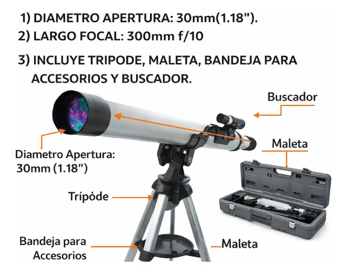 Descubre el Telescopio Astronómico/Terrestre Mlab 30×300 en un elegante color gris, diseñado para los entusiastas de la astronomía y la observación de la naturaleza. Con una apertura de 30 mm, este telescopio ofrece imágenes nítidas y detalladas, permitiendo explorar tanto el cielo estrellado como los paisajes terrestres con facilidad.